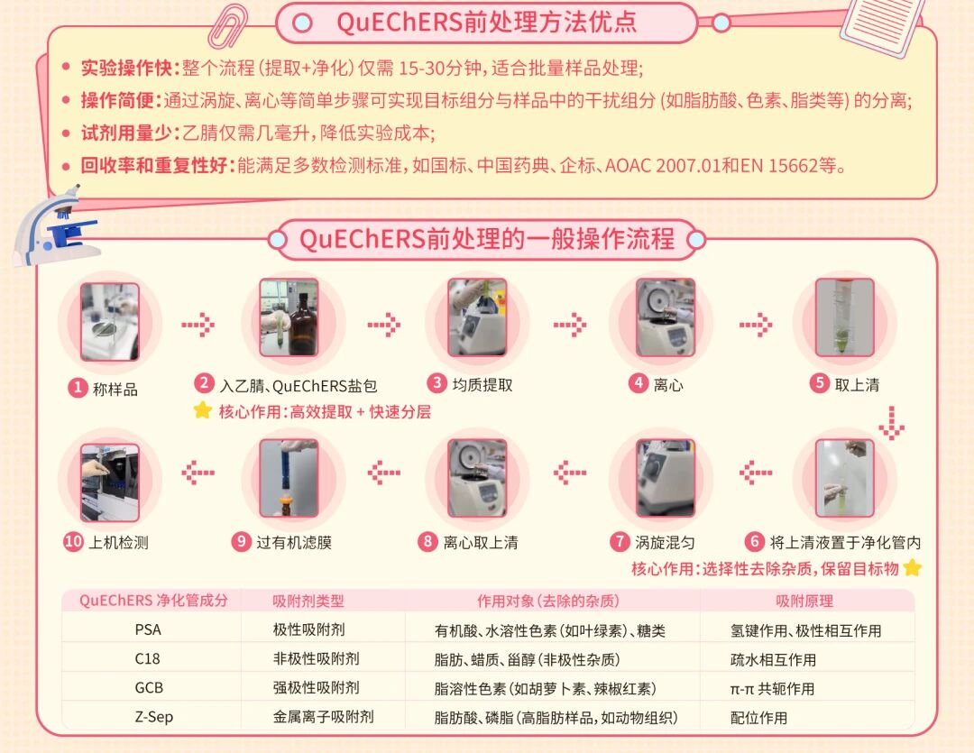 应用导向:针对食品检测的农残、兽残,环境检测的微量有机物污染等,推出相对应的QuEChERS前处理产品,为的是帮助客户省时省力,提高实验的效率~