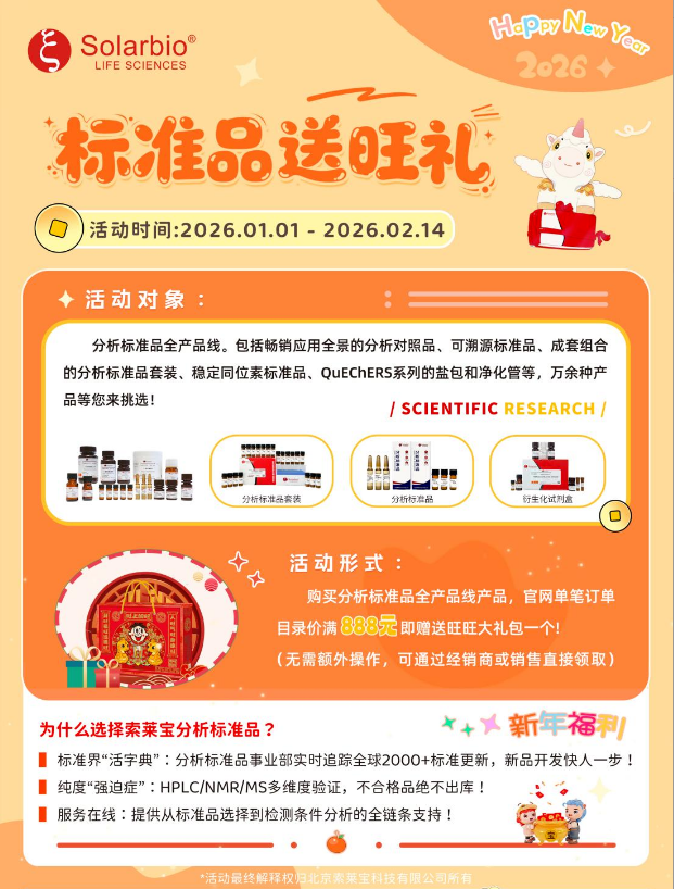 2. 新春科研省心 buff!即用型标准溶液开箱即测,像备好的年货般省时不折腾;定制款按需精准适配,如同专属年味直击实验痛点~ 新春服务不打烊,速锁你的科研 “年味装备”,新岁实验一路开挂!